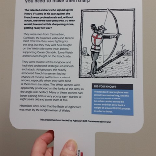 The image of Dafydd Gam was more challenging. We know he fought at the battle and we also know he died there. Some historians say he was knighted at the battle whereas others say this did not happen. However, following discussions, we decided to show Dafydd being knighted as it makes for a compelling narrative, not least since the Gam family tomb is in Brecon cathedral.